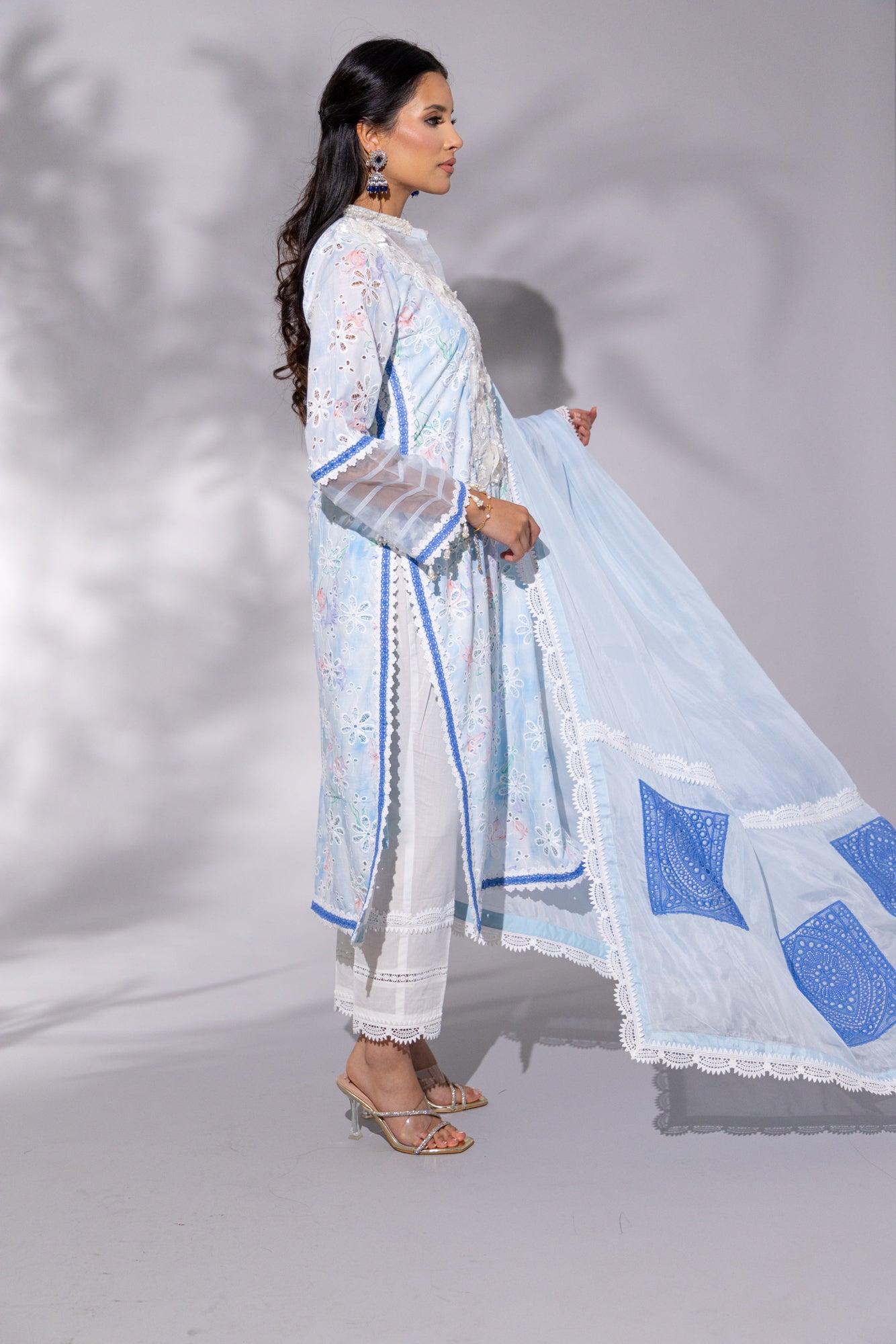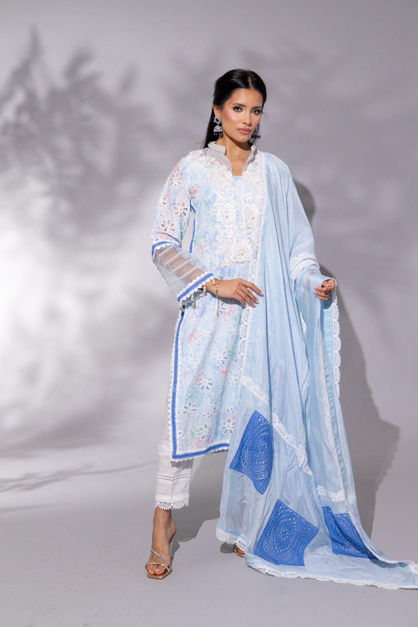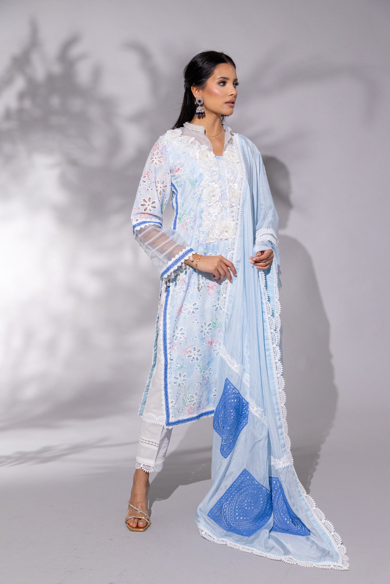 Cotton Candy Blue is the epitome of soft elegance — a dreamy baby blue palette brought to life with intricate floral chikankari embroidery. The long kameez features a heavy cutdana-embellished white neckline with delicate organza accents and a refined small collar. Armhole-to-daaman side lace detailing and full sleeves add a graceful frame, while the flowing heavy silk dupatta — adorned with laces and contrasting patchwork — elevates the look to formal perfection. Paired with crisp white cotton capri pants featuring lace hems, this set is a fresh yet sophisticated choice for festive brunches, Eid mornings, or graceful evening gatherings.
