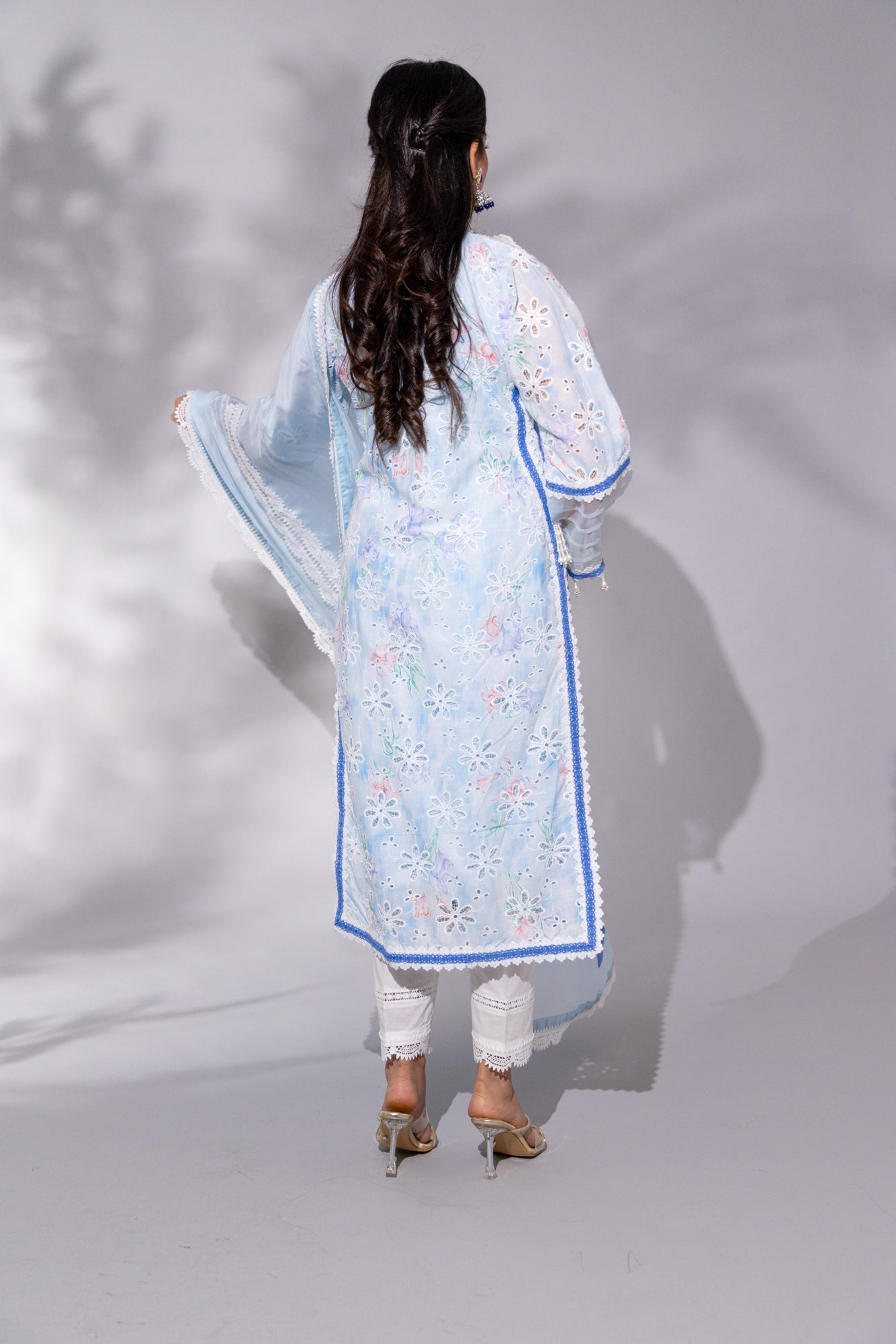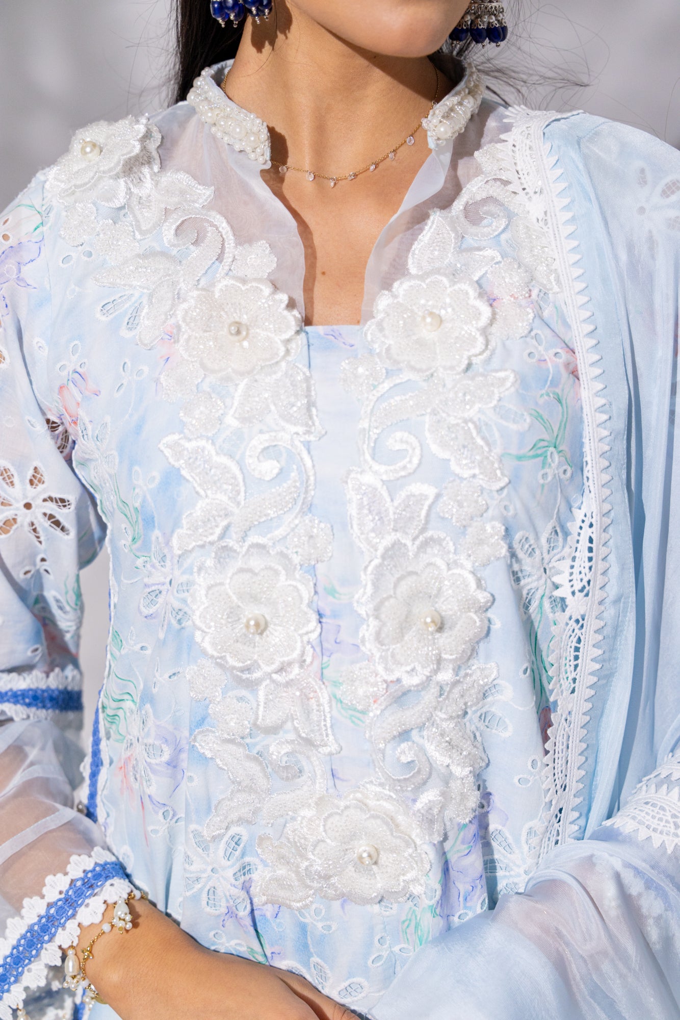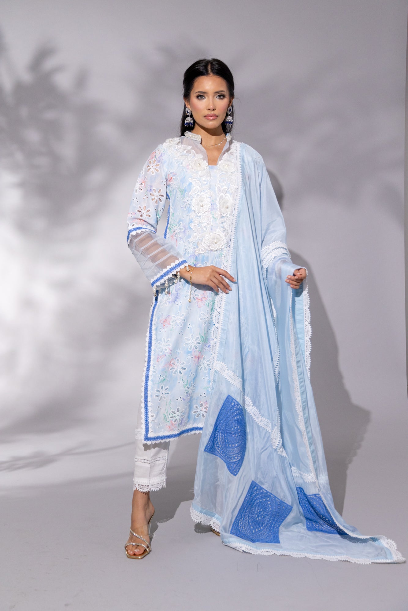Cotton Candy Blue is the epitome of soft elegance — a dreamy baby blue palette brought to life with intricate floral chikankari embroidery. The long kameez features a heavy cutdana-embellished white neckline with delicate organza accents and a refined small collar. Armhole-to-daaman side lace detailing and full sleeves add a graceful frame, while the flowing heavy silk dupatta — adorned with laces and contrasting patchwork — elevates the look to formal perfection. Paired with crisp white cotton capri pants featuring lace hems, this set is a fresh yet sophisticated choice for festive brunches, Eid mornings, or graceful evening gatherings.